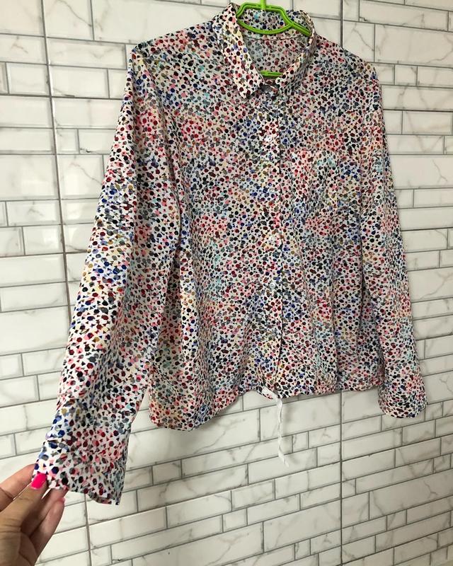 Класна блуза на ґудзиках Стан ідеал Понизу на кулісці) Розмір не вказано Поліестр , софт Довжина 64 Рукав 63, можна підкотити ) Плечі 44 Пог 56 Понизу 61, можна куліскою регулювати на менше ) Біцепс 20