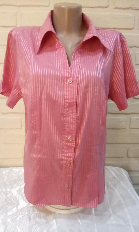 Блузка розового цвета с воротничком, застегивается на пуговицы. Тканина схожа на шовк. По переду, по низу, по бокам небольшие декоративные складки. Размер 44. Замеры- длина по спинке 57 см, полуобъем груди 55 см, полуобъем по низу 55 см, длина рукава 19 см, длина плеча 13 см.