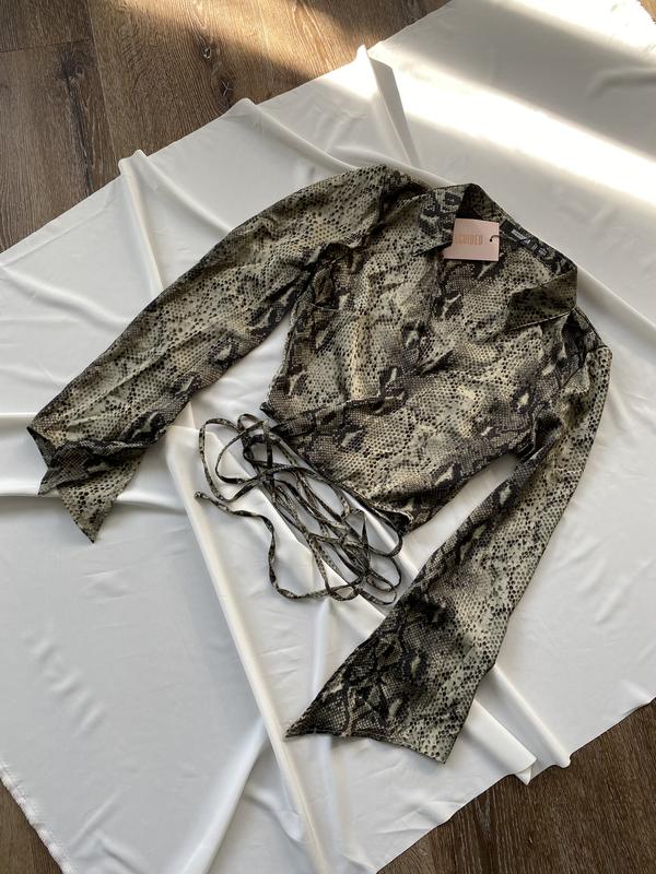 Дуже граний топ на запах. Знизу довгі лямки, можна по-різному зав’язувати. Гарні летючі рукави