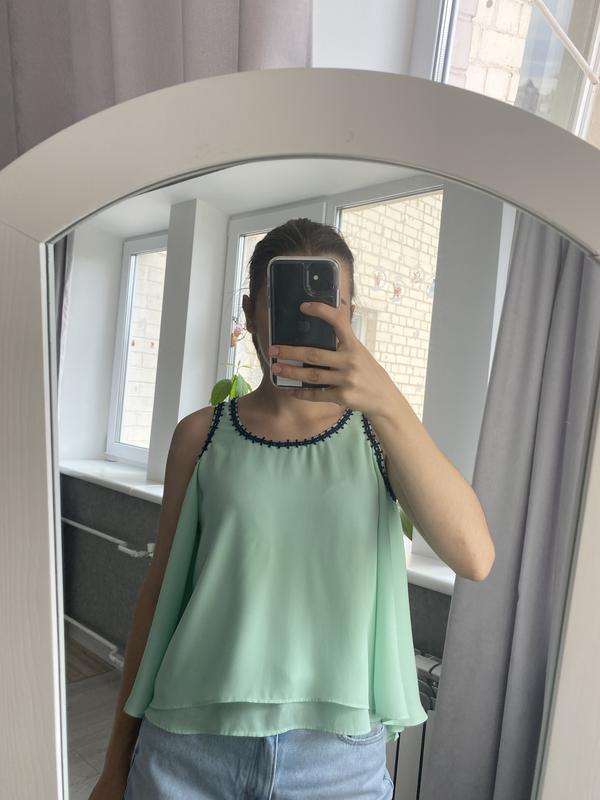 Легенька багатошарова блуза з красивою спинкою. Розмір Xs, невеличка S. Є нюанс- маленька плямка(на фото помітно)