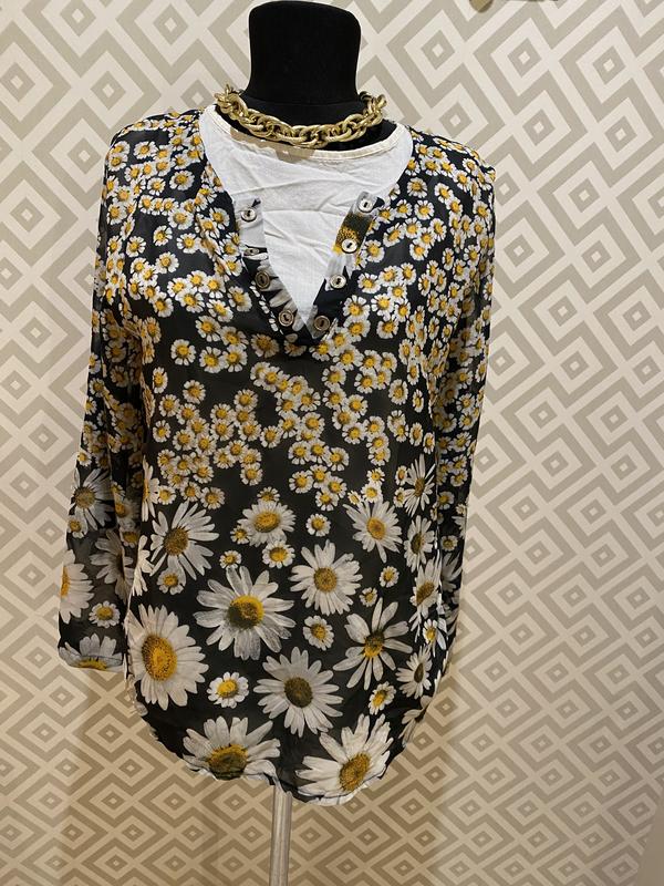 Блузка ромашки розмір 46/48 см , рукав від плеча 57 см ,від шиї 69 см,довжина 67 смобг 49/50 см