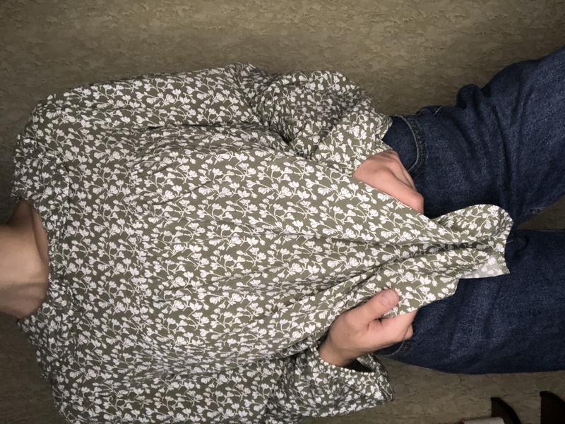 Гарна блузка, ідеальної якості. На рукавах резиночки. Зверху воротничок, який ззаду з’єднується ґудзиком.