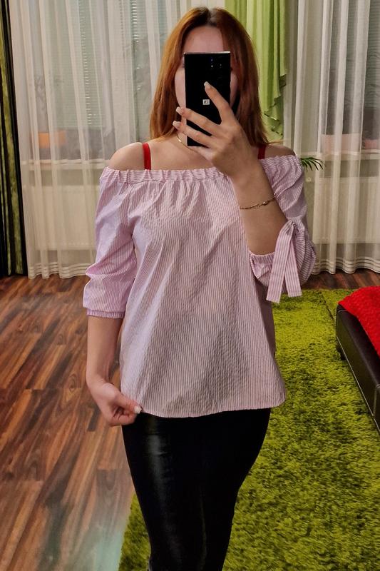 Нежная блуза с открытыми плечами и рукавами 3/4. Ткань на ощупь в виде "пупырочки". Была одета несколько раз. Выглядит совсем как новая.