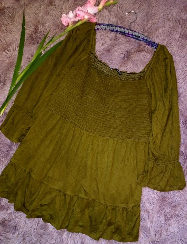 Кофтинка, блуза ярусна, топ- резинка, розмір 20uk, заміри: довжина 75, рукав 58, ПОГ 55-68, ПОТ 65, НИЗ 70. Тканина 96% віскоза, 3% еластан, 1% еластан. Стан ідеальний.