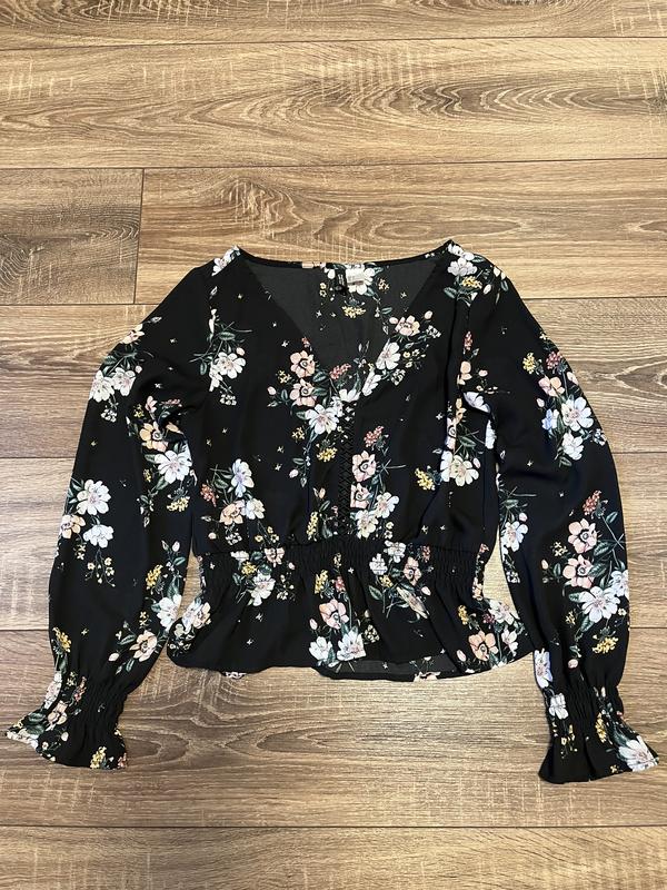 Коротка блуза з яскравим принтом та глибоким вирізом