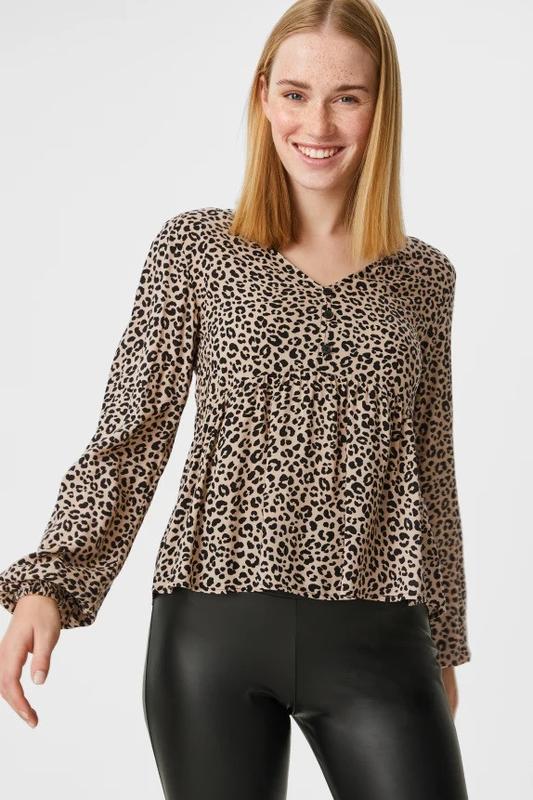Блузка CLOCKHOUSE из легкого материала. Планка с декоративными пуговицами и присборенный разделительный шов. Цвет: Черный, бежевый. Состав: 100% вискоза. Размер: евро 36 (S) - Длина от плеча 52 см, рукав от плеча 54,5 см, плечи 38 см, ПОГруди 43,5 см.