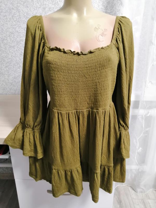 Жіноча, трикотажна кольору хакі блуза, розміром 14. Маде ін Індія. З віскози, поліестру, еластану. М'якенька, гарно тягнеться. Як нова. Корсет на резинці. Гарно підкреслює фігуру. Довжина 76см, ПОГ-43,ПОТ-39,ДР-56см ПОР в горі 28см.