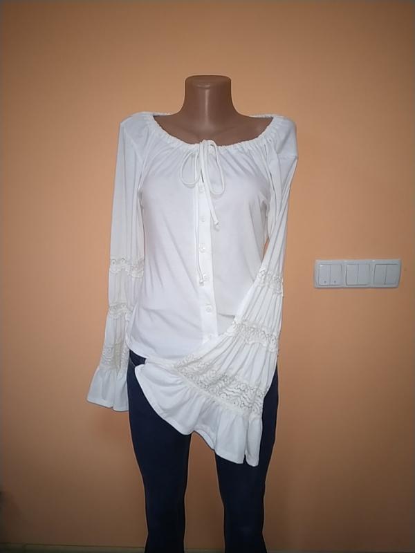 блуза з чарівними рукавами. є ледь помітні плями з правої сторони грудей. Думаю має відіпратись, в ціні враховано. декольте регулюється шнурівкою. Розмір відсутній тому орієнтуйтесь по замірам, розмір манекена s плечі - майже будь який розмір рукав - 64см довжина - 57см пог - 47-50см пот - 40-42см понизу - 45-47см