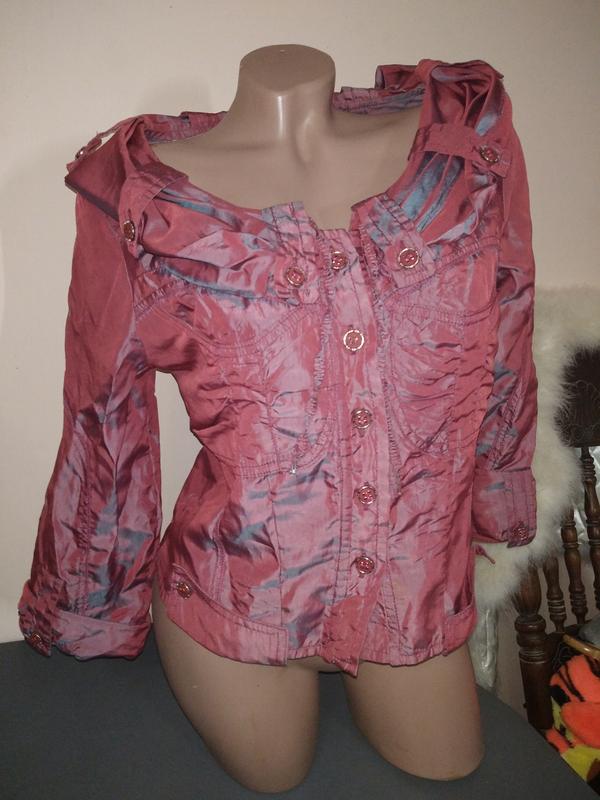 Кофта з атласу. З відливом. Цікавий фасон. Коротка.Рукав закриває лікоть.На наш 44. Красиво відкрита зона декольте.
