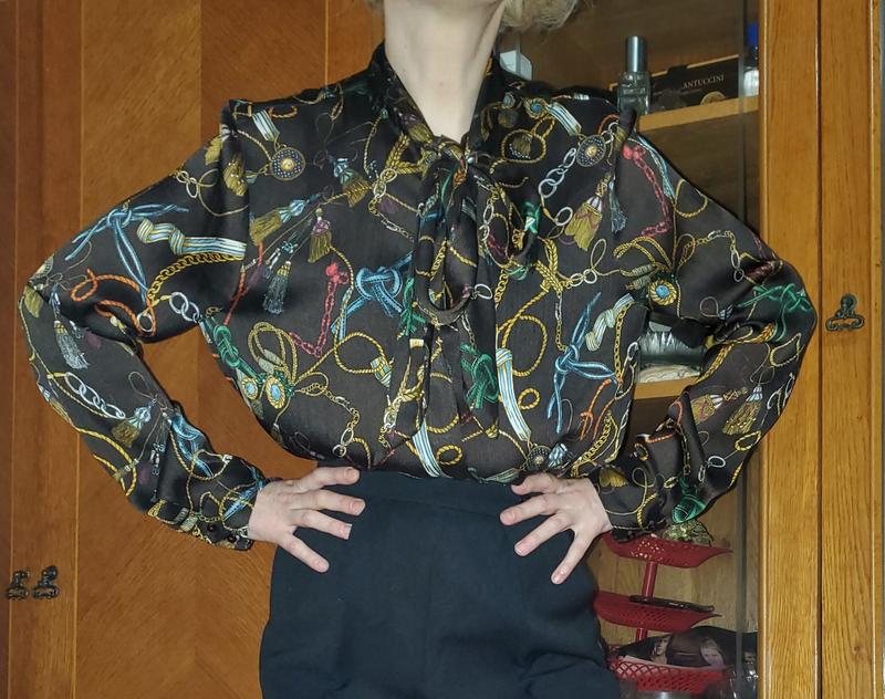 Блуза с бантом Zara принт цепи в стиле Hermes Versace, маркировка р. М, но отлично будет также ХС-С. На фото рост 160см 83-64-83. Состояние отличное, но есть зацепка на плече последнее фото, практически не видно. Качество классное, цвет коричневый с принтом. Замеры по запросу. Возврат не предусмотрен. Замеры: плечи 39см, рукав от плеча 58.5см, поб.груди 49см, длина от верхней точки плеча 69см.