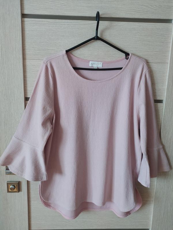 Ніжна блуза кольору запорошеної троянди (пыльная роза), чудова і дуже романтична, приємна на дотик. По боках є заокруглені розрізи, красивий рукавчик не довгий. Чудовий склад тканини, сама тканинка - жатка, дуже гарної якості. Різна довжина спереду і ззаду. Розмір вказаний 14, сяде на наш 48-50, в міру тягнеться. Орієнтуйтесь по замірах. ПОГ 55 ПОТ 55 ПОБ 56 плечі 41 загальна довжина по спинці 67,5 , спереду коротша примірно на 5-6 см. рукав 45, біцепс 17, перед воланом 15,5.