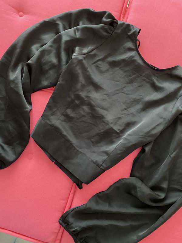 Атласна блуза з відкритою спиною на завязках, внизу є ще гудзики. Йде по фігурі , вкорочена, з гарними рукавами широкими. Класичний стильний варіант. Дуже гарно дивиться. Нова, з біркою , не підішла в талії.