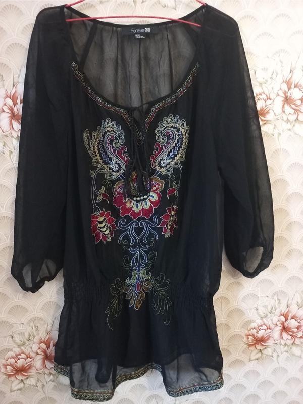Блуза Forever 21 З дуже гарним принтом На манжетах та в талії йде резиночка Йде трохи вільного крою Розмір: M Объем в плечах: 43 см Объем у грудях: 54 см Довжина: 74 см