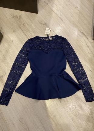 Красивая кофточка H&M в темно синем цвете. Рукава, верх и спинка ажурная. Очень красиво смотрится. Новая, со всеми бирками. Куплена в официальном магазине. Размер S, можно и на XS От подмышки до подмышки 36 Плечи 34 Рукав 57 Длина 55 Отлично тянется.