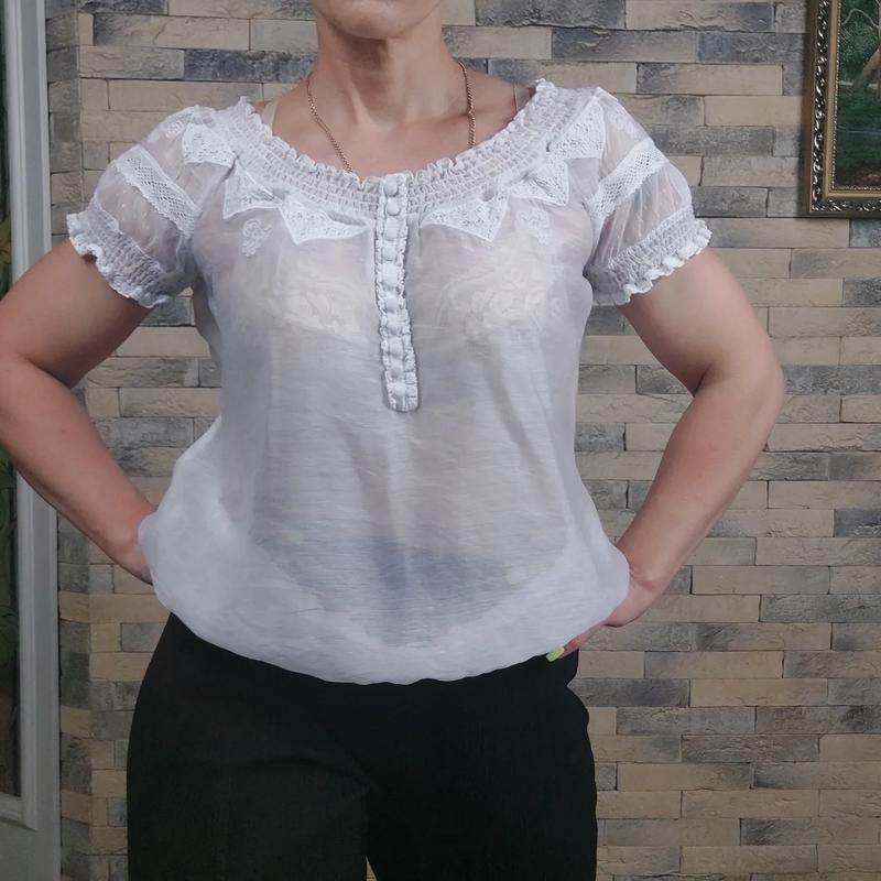 Дуже гарна прозора блузка Гарно зроблений рукавчик Стан ідеал 💙Розмір 40 вдіто на М ❗️❗️Мої параметри Гр -98 Талія 76 Бедра 100❗️❗️ Заміри : груди 57 см, довжина 56 см Віскоза /поліамід 💙