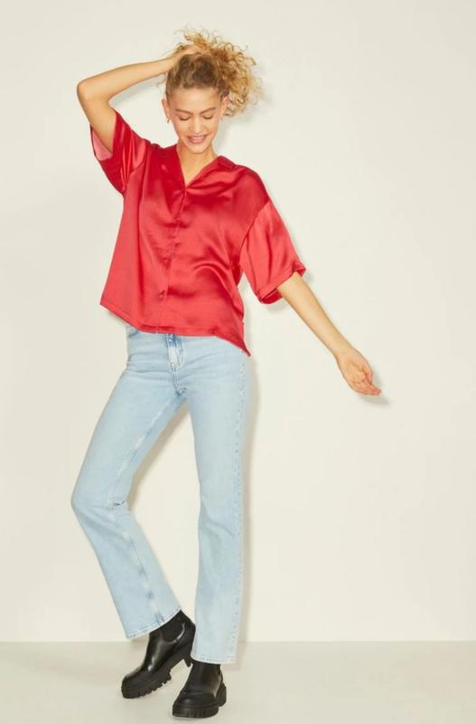 Сатінова сорочка яскравого кольору. Дуже гарна якість, нова. Розмір М