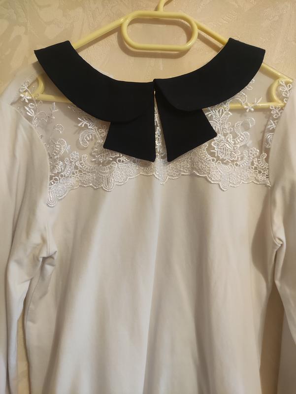 белая блузка с чёрным воротником и прозрачной сеточкой с узором спереди