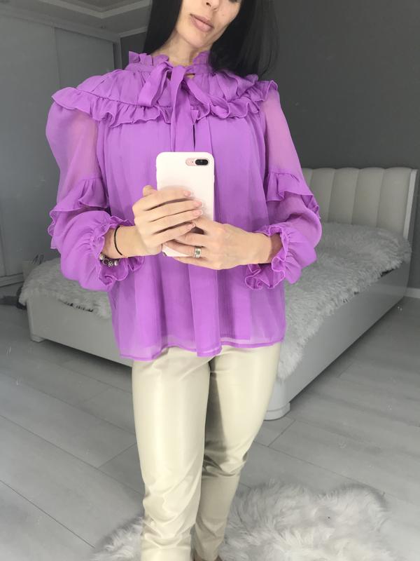 Шифонова блуза ,рукава внизу на резинці ,на шиї завязується на бант ,не прозора !
