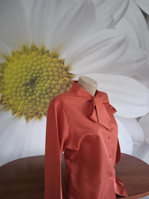 Класична однотонна блузочка з довгим рукавом темно оранжевого кольору. Легка та зручна. Приємна на дотик. Тонка, але щільна тканина. Не просвічується. Практично не тягнеться. Лягає по фігурі. На гудзичках. Прикрашена акуратним бантиком. Рукавчик-фанарік,на манжеті. Є у червоному кольорі. Є розміри.