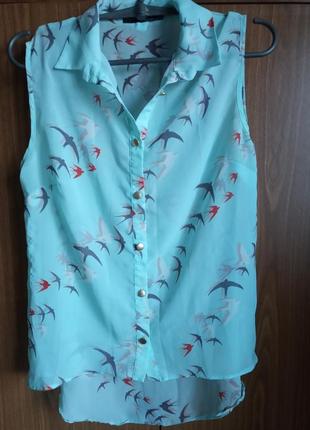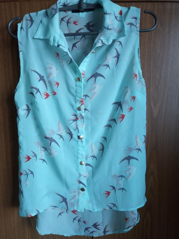 Напівпрозора блузка з принтом ластівок. Дуже гарна. Стан ідеальний. Довжина плеча - 12см. Довжина блузки - 70см. Ззаду блузка подовжена. Напівобхват грудей - 46см. Дивіться також інші мої оголошення 😊 Всім приємних покупок)