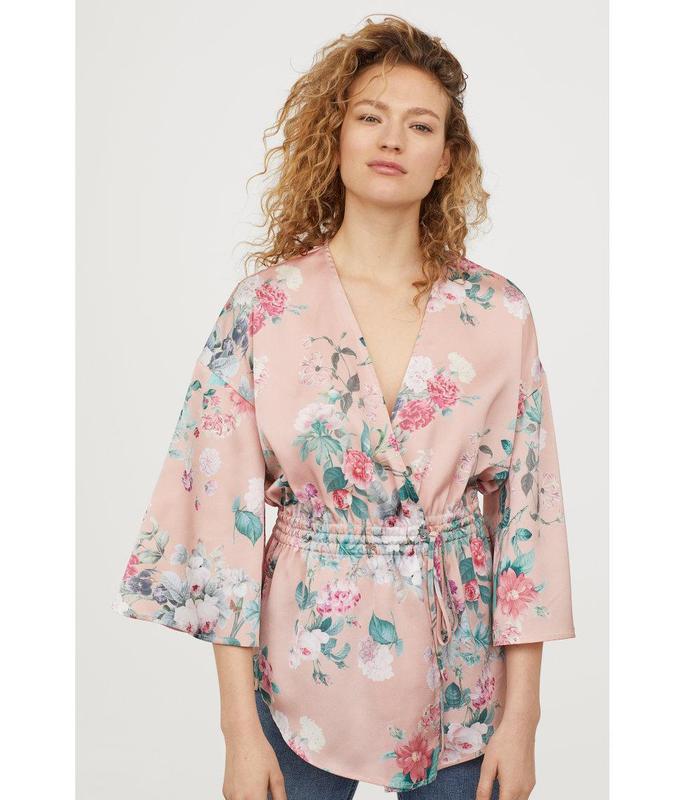 Блуза-кимоно с V-образным вырезом с отделкой из крепа от шведского бренда. Сборка с кулиской и резинкой на талии, двубортная застежка на три кнопки спереди, заниженные плечи, рукава 3/4 и закругленный низ. Ткань средней плотности, мягкая, не тянется. Сток, без бирок. (4793) Размер: S (36/38) Полуобхват груди: 52 см Полуобхват талии: 36 см, тянется до 46 см Полуобхват бедер: 54 см Ширина проймы: 21 см Длина рукава от горловины: 56 см Длина изделия: 72 см Состав: 100% полиэстер