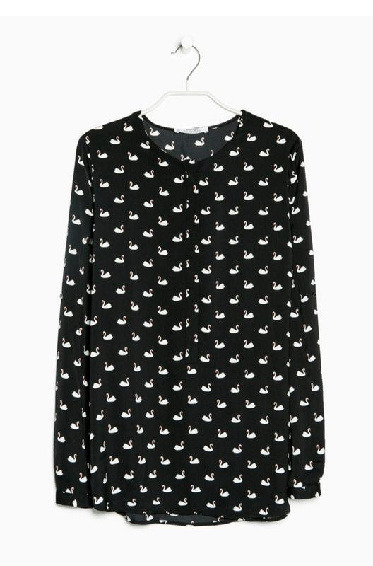 Красивая черная блуза с мягкого полиэстера в принт 'белые лебеди 🦢' с круглым вырезом, скрытой планкой с 5-ти пуговок и длинными регулирующими рукавами.