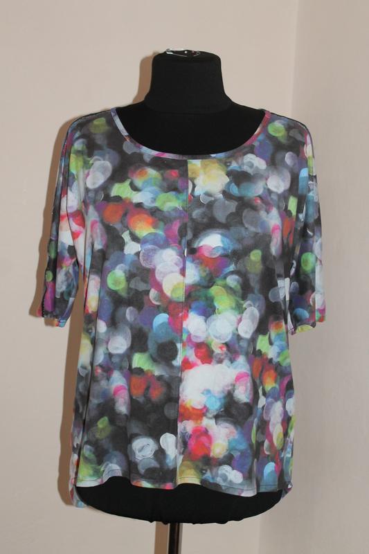 Класна кофта вироблена в Португалії для нідерланського бренду, розмір Л, спереду коротша,ззаду довша.92%-поліестер, 8%-спандекс, тягнеться гарно.Довжина-79см ззаду, 61см-спереду, рукав від горловини-41см,пот-60см,поб-62см.Фасон оверсайз.