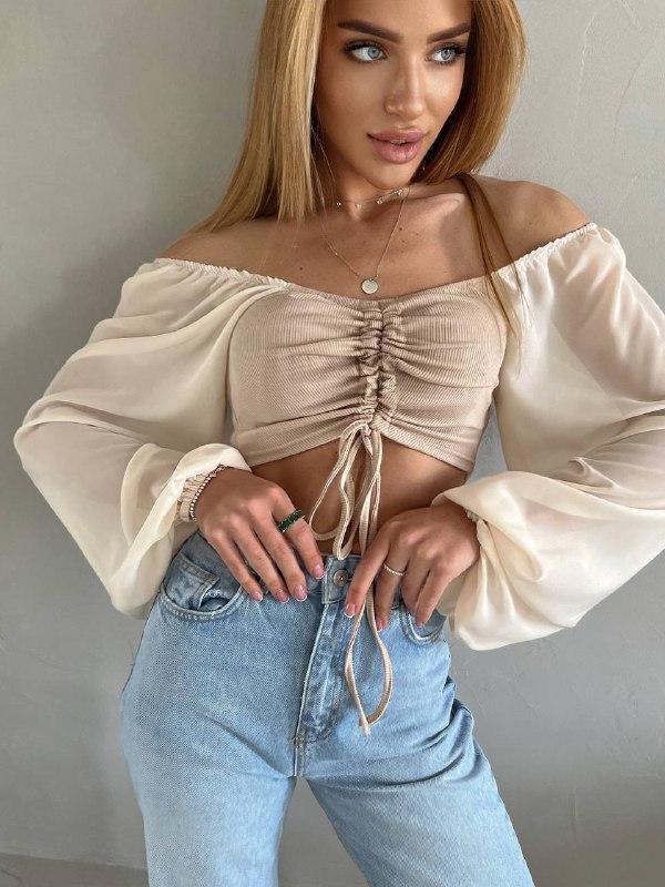 Жіночий Топ на затяжках Топ з об'ємними рукавами Літня блуза Блузка Широкий Рукав ШИФОН Топ на затяжках Топ з об'ємними рукавами, спереду затягування, можна регулювати довжину та виріз виробу. Модель ідеально підходить на кожен день та для особливого випадку Модель 023 Тканина: шифон, рубчик Розміри: 42-44; 44-46 Кольори: беж і чорний