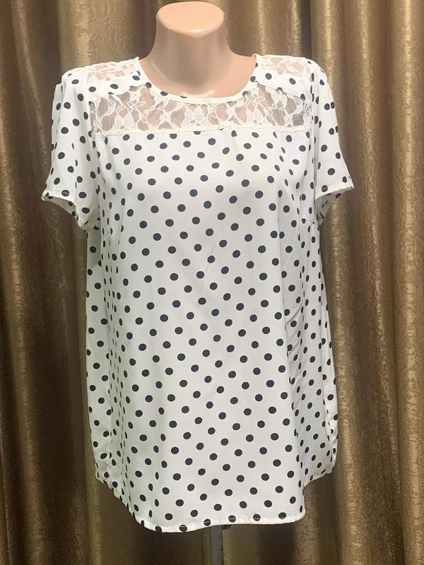 Белая блузка в черный горошек с красивым кружевом на плечах, разыир 2xl