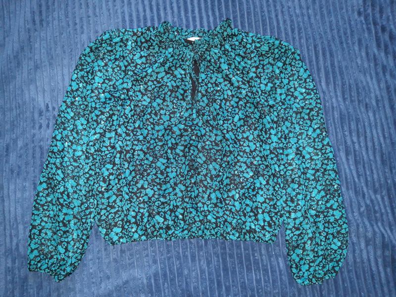 Блуза на підкладці крім рукавів, рукав просвічується. Рукав та внизу блуза на резинці. Під руками трохи розійшлася тканина, можна зашити. Довжина 55 ширина під руками 50 плече 9 ворот 2 рукав від плеча 65