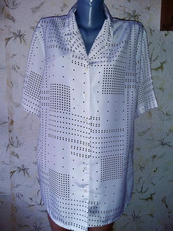 Размер на этикетке: D/NL 46, 20GB, F 48, I 52, но лучше ориентироваться на замеры. Цвет: белый, принт - черный. Ткань: блузочная, средней плотности, не тянется, не просвечивает. 100% полиэстер. Состояние: идеальный, без дефектов и нюансов. Замеры: ~ длина от верхней точки плеча до низа: 77. ~ длина рукава от плечевого шва: 28. ~ длина рукава от горловины: 43. ~ полуобхват проймы: 27. ~ полуобхват по низу рукава: 20. ~ полуобхват груди с вытачками: 65. ~ полуобхват талии: 63. ~ полуобхват внизу: 65. ~ ширина между плечевыми швами: 47. ж.