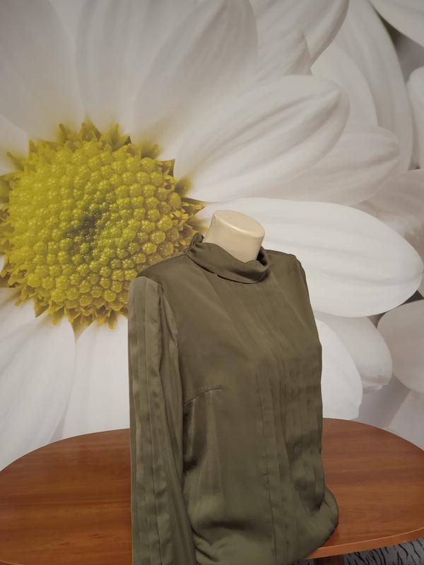 Класична однотонна блузочка з довгим рукавом насиченого кольору хакі. Легка та комфортна. Приємна на дотик. Тонка, але щільна тканина. Не просвічується. Практично не тягнеться. Лягає вільно,з напуском на резинку по низу. В переді,і на рукавчиках прошита складочками. Акуратна стієчка. Є розміри.