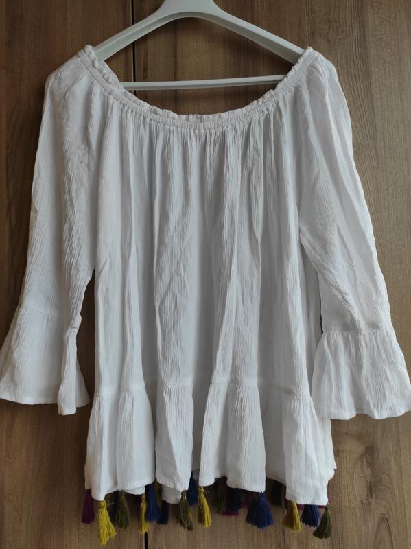 Блуза белого цвета с помпончиками внизу со спущенными плечами. Размер 14. Длина 65, длина рукава 52, плечи свободно, ПОГ 60-63, ПИТ до 55, низ до 75. Стан идеален!