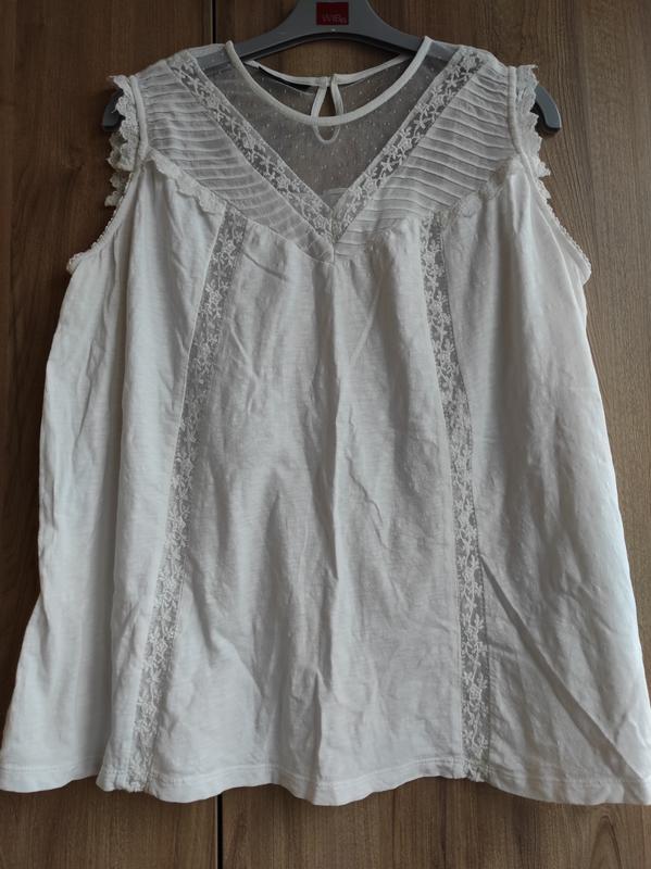 Блуза белого цвета KIABI, с кружевом. Размер 16. Длина 67, плечи 40-42, ПОГ до 62, ПИТ до 55, низ до 75. Стан идеален!