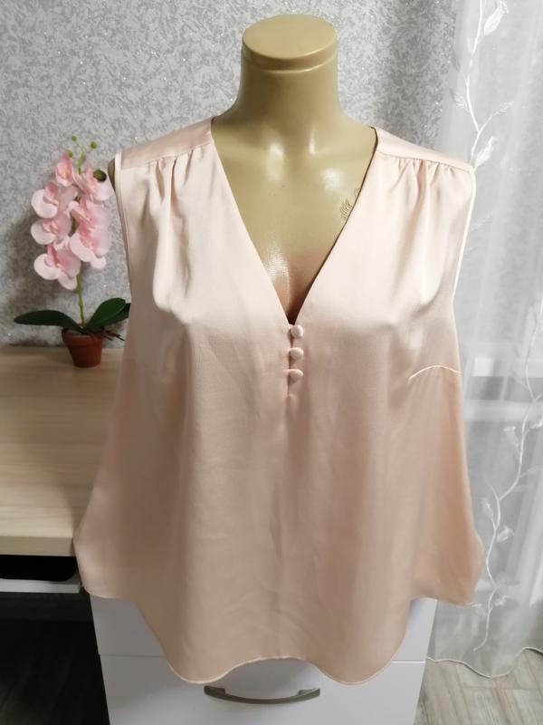 Женская бежевого цвета блуза без рукавов из полиэстра, размером 18. В идеальном состоянии не тянется, замеры на фото, качество отличное.