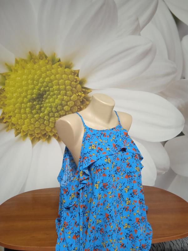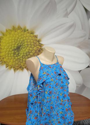 Стильна блузочка з довгим рукавом та оригінальним квітковим малюнком на синьому фоні. Легка та зручна. Приємна на дотик. Цупка щільна тканина. Гарно спадає. Не просвічується. Практично не тягнеться. Лягає вільно. Фасон прямий. Відкриті плечі. Прикрашена акуратними рюшами. Є розміри.