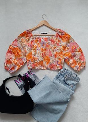 Блуза оранджевого колтору в квітковий принт.Розмір вказаноS,але по факту більше на М.