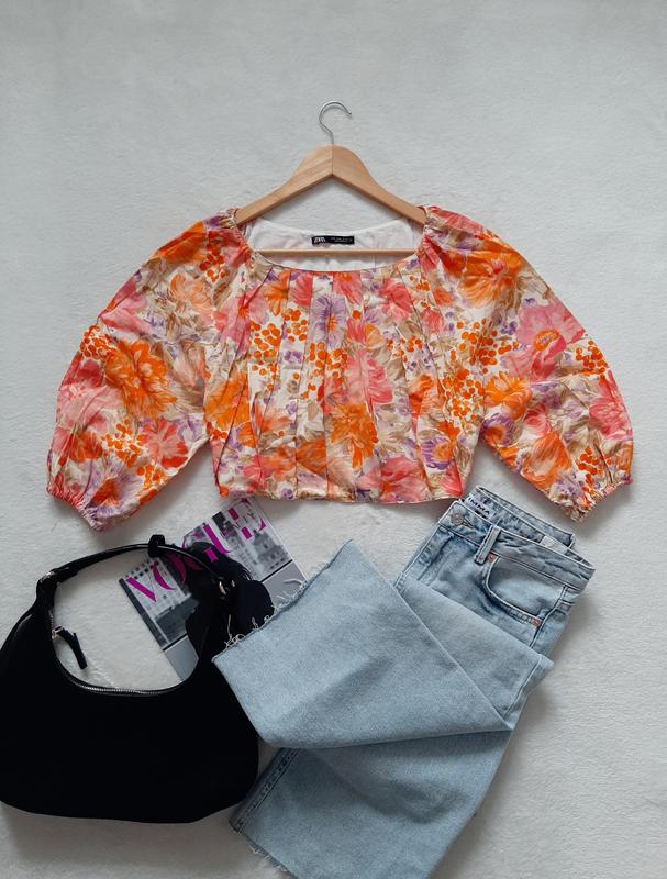 Блуза оранжевого колтора в цветочный принт.Размер указанS, а по факту больше на М.