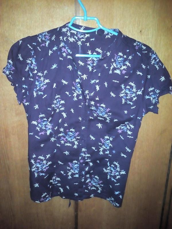 Блуза летняя с коротким рукавом, на пуговицах, воротник "стоечка", узор "Стрекозы", сзади завязывается на тонкий поясок, рукав присобран на резинку
