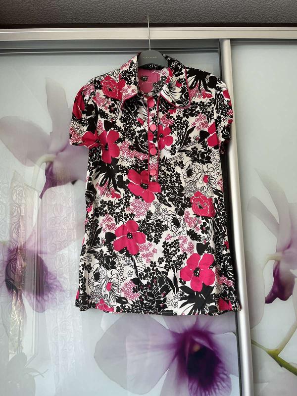 Блуза принтована. По ощущению напоминает шелк. Склад тканини на фото. Состояние новой. Производитель Турция. Размер Л.