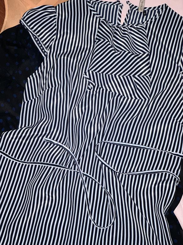 Состояние новой вещи. Полиэстер, не просвечивается, не тянется. На груди есть вытачки, более широкий поясок. Длж-62см Ног-48/49см К низу прямая