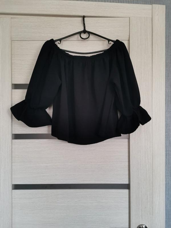 Черная блуза с рукавами воланами. Можно носить как с открытыми, так и с закрытыми плечами. Размер по набору M/L (я одевала на S) Ткань достаточно плотная. Стан - идеальный.