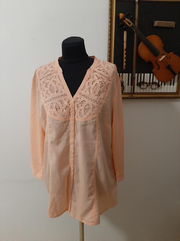 Очень красивая блуза с изумительным кружевом в красивом - персиковом цветеБлуза застёгивается на пуговки.Рукав в блузе можно подвернуть( есть - шлея) Качественный ,лёгкий материал.ЗАМЕРЫ- ПОГ- 60СМ.,+ ВЫТИЧКИ. РУКАВ- 47 СМ.( МОЖНО ПОДВЕРНУТЬ) ,ДЛИНА- 80 СМ.