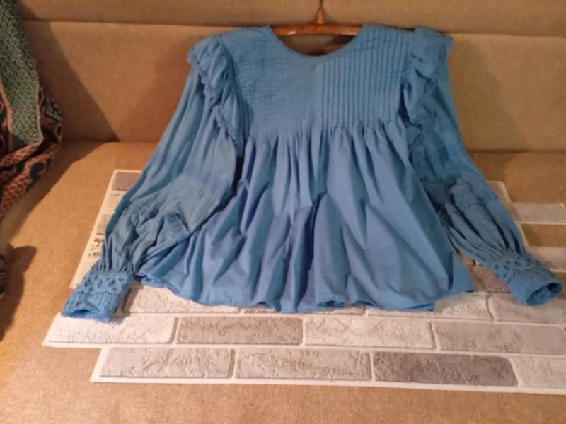 пишна,типу розлітайка, длина 58,пог 50,низ 90,рукав пишний на широкому манжеті 61,плечі 37,стан дуже хороший, єдине це цяточка спереду,вона не помітна, так як заходить в складку,заглажується,зовсім мала, на фото показано.,все інше ідеально Індія, котон.