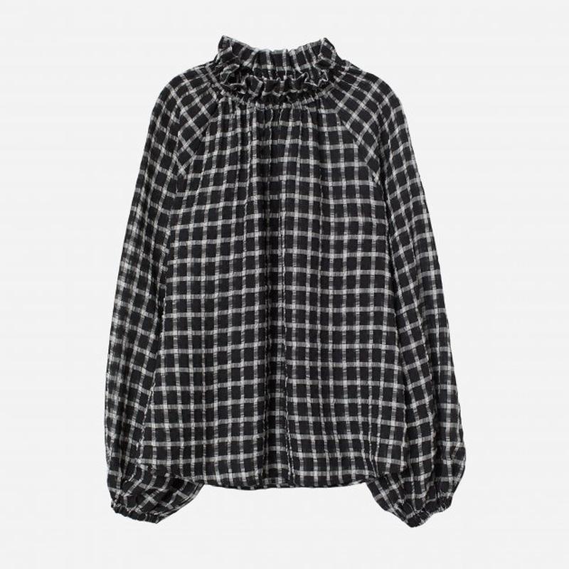 Блузка из воздушного плетения с эластичным вырезом горловины и небольшим воротником с оборками. Длинные рукава реглан с узкой резинкой на манжетах и закругленным краем. размер М