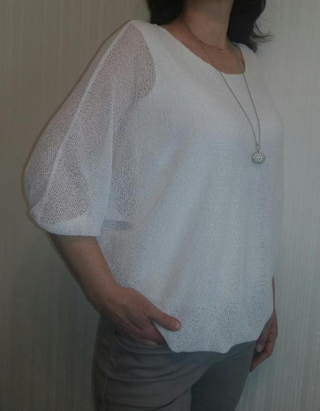 Блуза молочного цвета,рукав 3/4, внизу на резинке.Блуза на подкладке - маечка (майка сшита по плечам и по низу с блузой).Низ на резинке. Размер оверсайз, подойдет от 48 до 52. Замеры по верху (по сетке) : длина по спинке 58 см. длина рукава от горловины 48 см. ПОГ - под летучей летучей мыши 68 см. ПОБ - 60 см. внизу Гумка без натягу ПОБ 36 см. тягнеться до 56 см. Майка очень тонкий трикотаж. хорошо тянется.