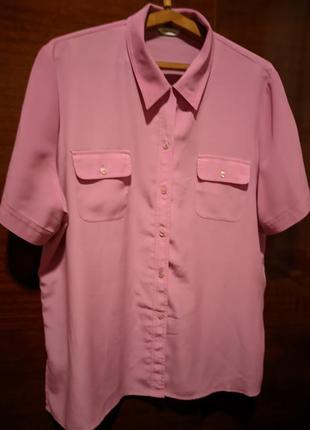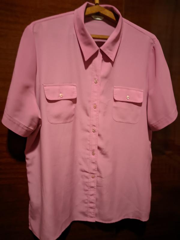 нежно сиреневого цвета, на пуговицах, на груди накладные карманы, по бокам разрезы, полу-окружность груди -65см, полушерсть бедер -65см, длина блузы -75см.Фото цвет не передает.