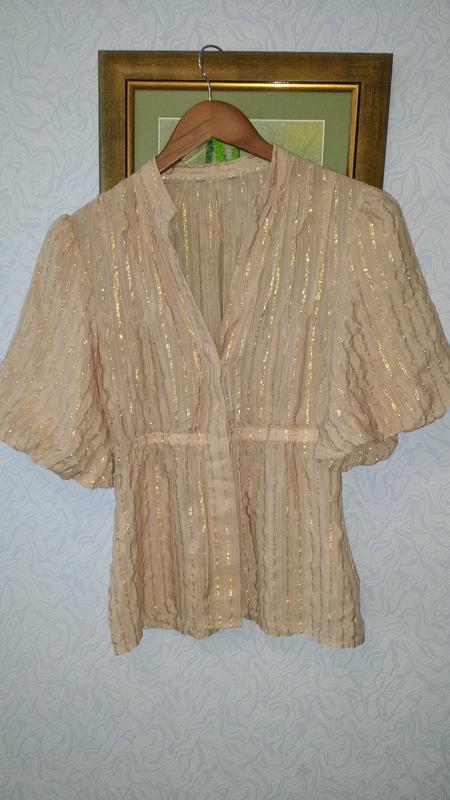 Очаровательная блуза с пышными рукавами, шелковая с тонкой золотистой люрексовой нитью, бирочка с брендом срезана,8 размер ориентируйтесь на замеры, длина по спинке 59, длина рукава 31, ПОГ 42, ПОТ без растяжки резиночки 34, ширина внизу 48, шелк не тянется, учитывайте, берите с запасом.
