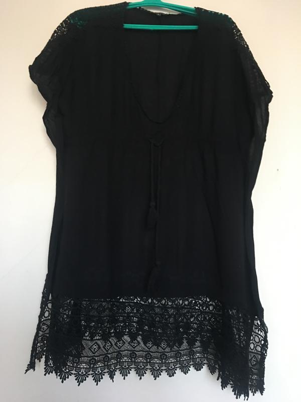 Длинная блузка с красивым кружевом на плечах и внизу