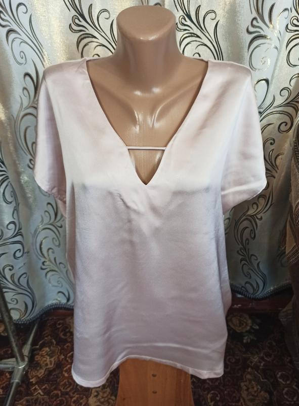 Стильна літня блуза Mango Колір - пудра Розмір - EUR L Заміри: - напівобхват грудей - 64 см, - довжина - 65 см. Склад: перед 100% поліестер, спинка 100% віскоза Стан ідеальний